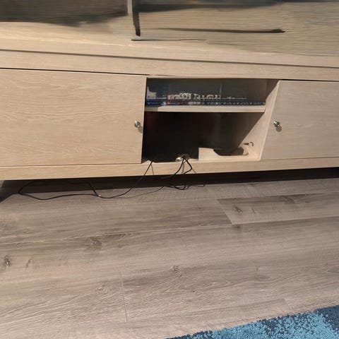 Materiale: Melamine krop, glass topp, MDF fronter og sort metall fot
