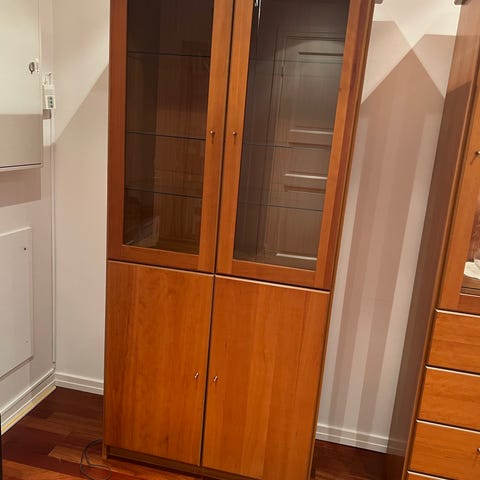Pent og praktisk vitrineskap laget av eik med god oppbevaringsplass.