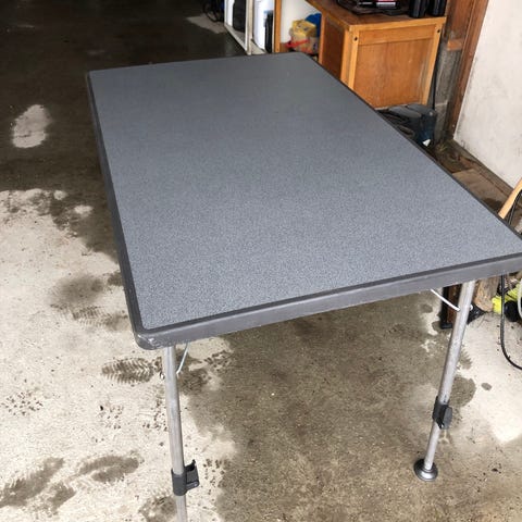 Et lettvektsbord som er stabilt. Bordet har en glassfiber flate med plastikk som er varme og vannbestandig. Dette Campingbordet har en aluminiumsramme og føtter som er justerbare for å sørge for at bordet er stabilt uansett grunnlag.
