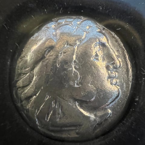 Alexander den Store var den unge kongen som befridde grekerne fra perserne, og erobret en hel verden. Riket hans strakk seg fra Europa til India. Dette kan være en av myntene som lønnet hans soldater.