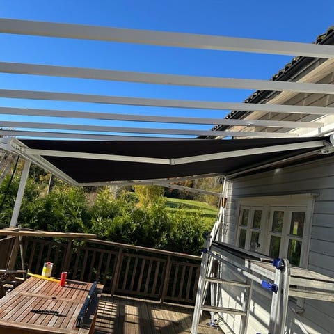 En svært solid terrassemarkise. MARKEDETS BILLIGSTE TERASSEMARKISE I HELKASETT