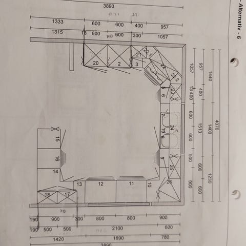 Målene på platen ser du på tegningen. Den har et hull til koketopp eller vask, det er markert på tegningen.