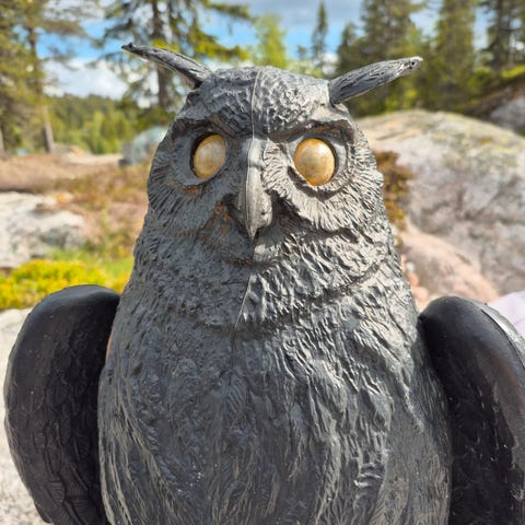 Størrelsen på produktet er tilsvarende størrelsen som er på Skjærer. Vekten er 460 g. Effektiv og brukes oftest i kombinasjon med andre typer repellenter. Hold Skjærene i sjakk med denne enkle og effektive etterligningen av en død fugl. Oppretter en oppfattet faresonen for målrettet fugl. Bør flyttes jevnlig rundt, og legges/tas ut og inn slik at de andre fuglene ikke venner seg til denne døde fuglen.