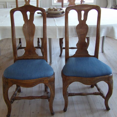 Kraftige og robuste stoler / tronstoler i barokkstil. Gullforgylt treverk og kraftig blåfarve på trekket. Flotte utskjæringer og rikt detaljert.