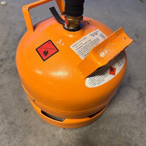 5 kg stål grå med klick-on ventil. Gass 349.- flaske 599.-
