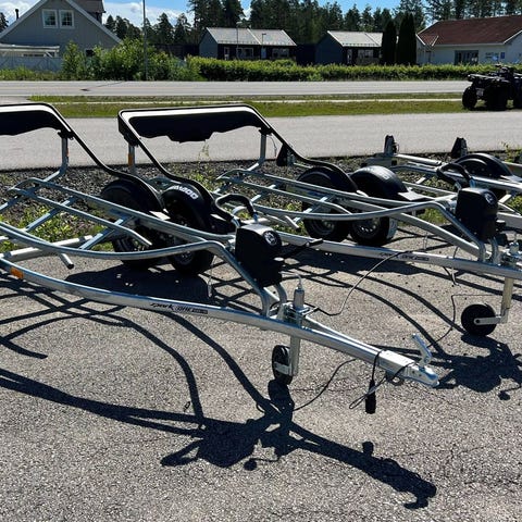 Robust feste. Ikke noe behov for separate støtter. Enkel å bruke. Smart, patentert Click & Go låsemekanisme. Hengslet lysbom beskytter lysene når den settes på vannet og ved flytting. Ikke noe behov for festestropper. Sikker design. Myk design beskytter vannscooteren og brukeren. Dimensjoner: Total vekt 400 kg (gjør det mulig å slepe tilhengeren også med mindre biler), 390 cm total lengde, 160 cm total bredde. Uten brems