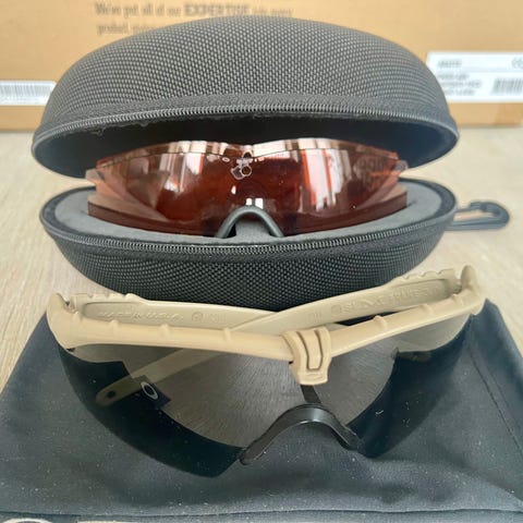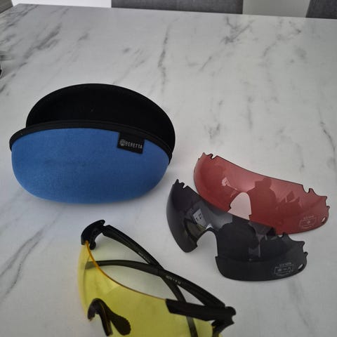 Alle skytebrillene leveres med glassholder, dekkskive og etui.