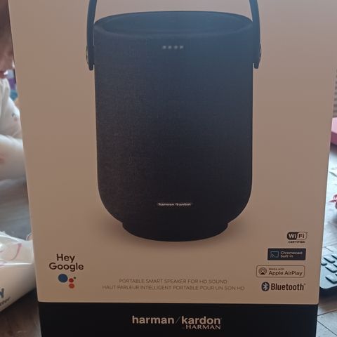 Kompakt smart-høyttaler fra Harman Kardon med kraftig lyd. Kan kobles sammen med alle høyttalere som har Google Assistant. Kan kobles med Bluetooth, Wifi og Airplay.