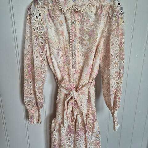 Skjortekjole med et stilig heldekkende mønster og fine fargekombinasjoner. Kjolen har korte frynser over hele som gir en nydelig fjær effekt. Den har spiss krage og knapper nedover hele fronten, med nydelige blonde-detaljer på kantene. Lange ermer med smock-detaljer rundt håndleddet. Snittlinje i skjørtet med små legg. Fòr i hele kjolen forutenom ermene. Kjolen har en rett passform. Den har knyting i livet om man ønsker en smalere passform. Denne kjolen er stor i størrelsen. Vi anbefaler å gå ned en størrelse.