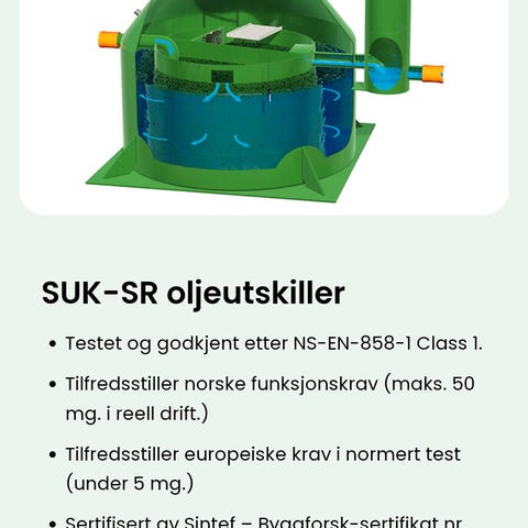 Den er dimensjonert og testet etter SIST-standarden EN 858-1 og EN 858-2.