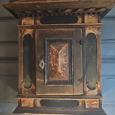 Skap / hengeskap i barokk stil fra slutten av 1700 tallet med senere eierinitial M.L (P) J.T og datert 1842.