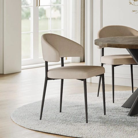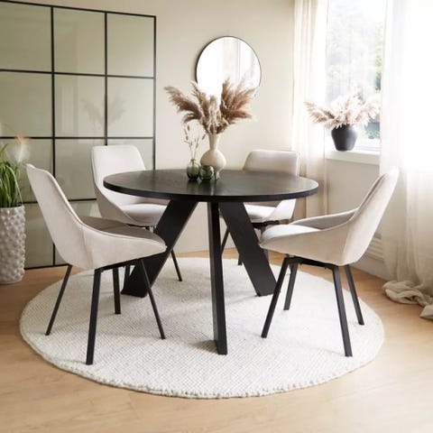 Eksklusivt, rundt spisebord i 40 mm Europeisk heltre eik-langstav, plank med flott bredde. Fasettskåret kant. Leveres med Stjerne X-ben i sort, pulverlakkert-søm-slipt stål som standard.