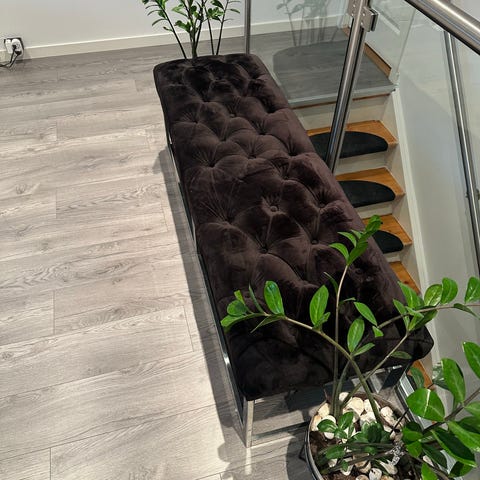 En vakker mørkeblå fløyelsbenk / sittebenk med gullbein og oppbevaring.