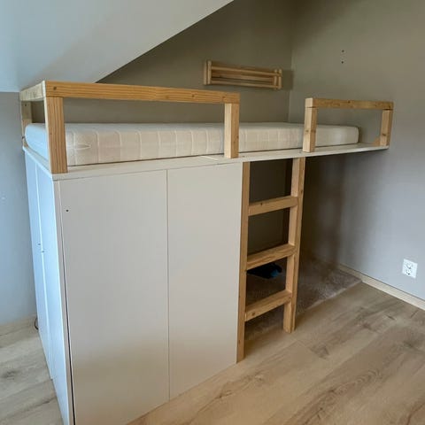 Vær oppmerksom på at leveransen bare inneholder en sengeramme; madrass og gardiner er ikke inkludert. Sengen er enkel å montere.
