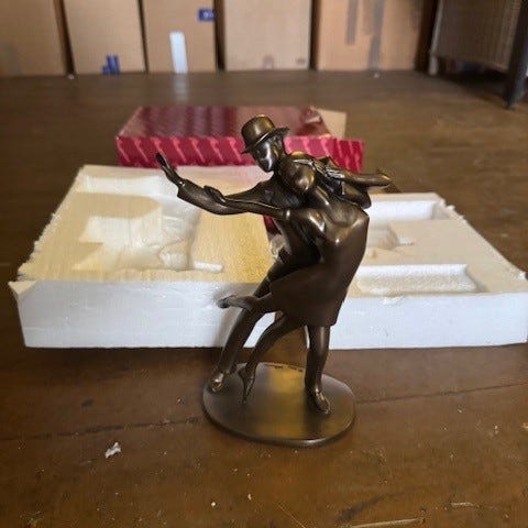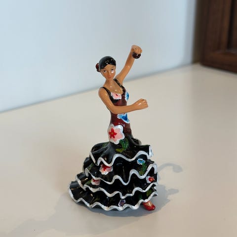 Hun er laget i polyresin og figuren er 25 cm høy og bunn er 12x13 cm. Ny selvsagt