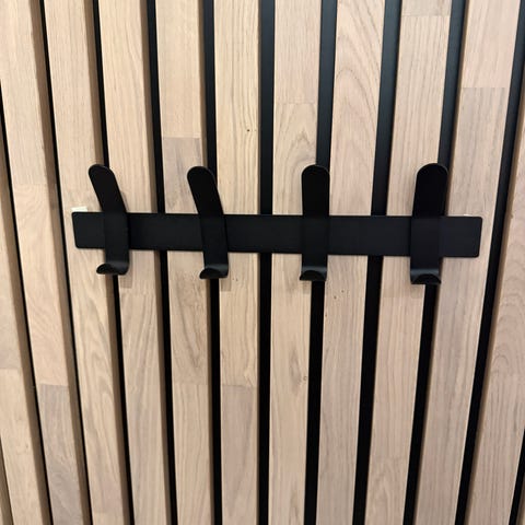 spilevegg, spilepanel, lyddempende vegg, akustikkpanel, trespiler, bjørkefinér, eikefinér, spilevegg med knagger, veggpanel, dekorvegg, interiør spilevegg, moderne veggpanel, opphengsvegg