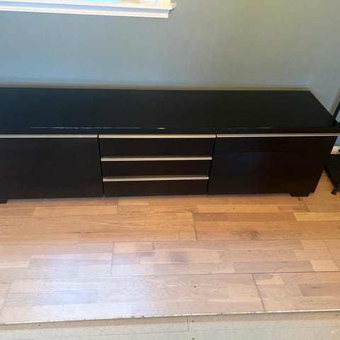 Stereobenk laget av furu selges. Den er praktisk med både skap og skuffer. Høyde 53 cm, bredde 87, dybde 43.