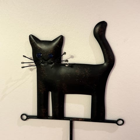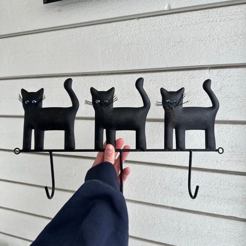 Solid, sort knaggrekke med tre vakre katter, hvor halene fungerer som kroker.