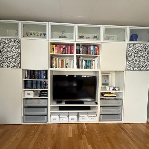 Vi lager plassbygde reolløsninger, og du må beregne ca kr. 48000,- per meter innredning, i malt MDF.