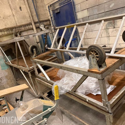 Tilleggsbordet kan stilles i samme høyde som arbeidbordene. Kan leveres med nedre hylleplan. Bordene har 4 svingbare hjul Ø=100 mm, hvorav 2 med brems. Lastekapasitet 150 kg.