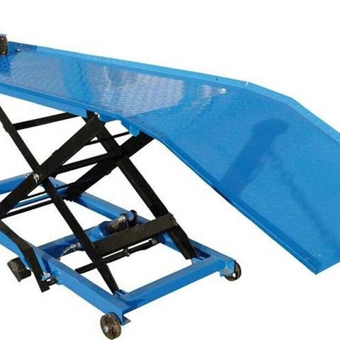 Stor løftebord for motorsykkel og moped. Løftes med fotpumpe. Platen i bakkant kan tas bort for nedsenking av bakhjulet.