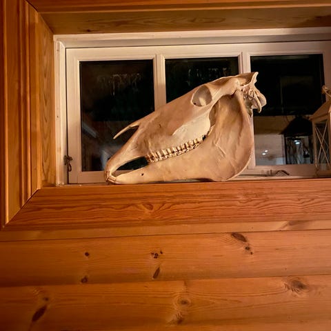Hodeskalle av okse. Veggfeste bak. Den er kokt, rensa og bleika. Stilig interiør!