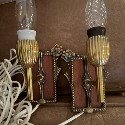 Lampen og figuren er på sokkel i tre, figur bestående av en flott dame som holder i en pelslignende "hand muffs", lampe ved siden av.