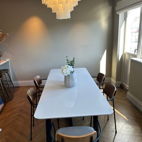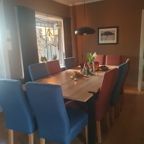 Frogner spisestol fås i en rekke stoff og farger, disse kan ses i butikken.
