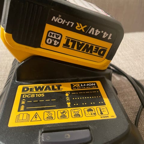 Batteri/batterilader følger ikke med, lampen er ikke av merket Dewalt.