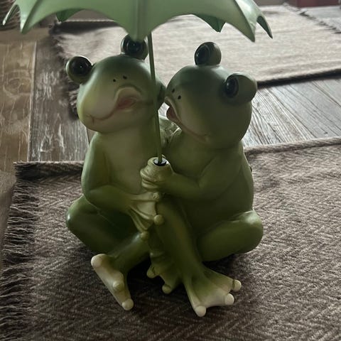 Frosk i grønn utgave, glasert. Den er produsert i keramikk og er 12 cm lang og 8 cm høy. Morsom hagepynt. Ta mål, så ser du størrelsen.