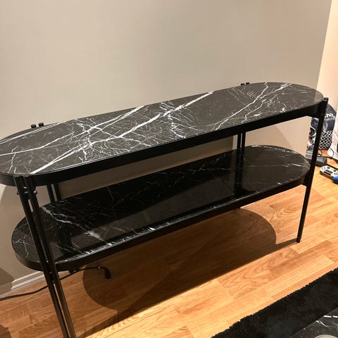 Et meget flott konsollbord meed stilrent gullfarget understell og en svart plate med hvit krakelering. Det hvite i den svarte marmorplaten gir et meget flott og stilig uttrykk.