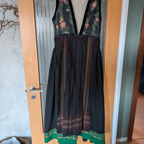 Komplett kvinnebunad fra Sogn med svartsøm skjorte. Sølv kommer i tilegg. Skreddersydd til din figur.