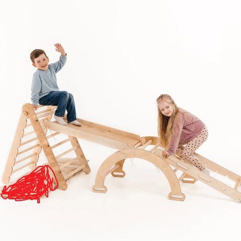 Dette klatresettet i tre, laget i Montessori-metodens ånd, gir ikke bare god underholdning, men utvikler også sosiale og motoriske ferdigheter og styrker barnets koordinasjon. Det er en flott gave til gutter og jenter som vil inspirere barn til å utforske verden og tilbringe tid med venner. Vi sørger for at det er en uforglemmelig opplevelse som vil fremme barnets utvikling og samtidig opprettholde de høyeste sikkerhetsstandardene.