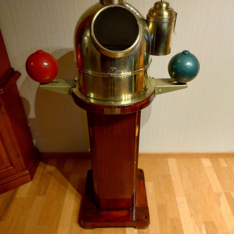 Stort natthus på teak sokkel fra tidlig 1900 tallet / 1900tallets første halvdel, med kompass, lamper på hver side (mangler lokk til lampen til høyre),