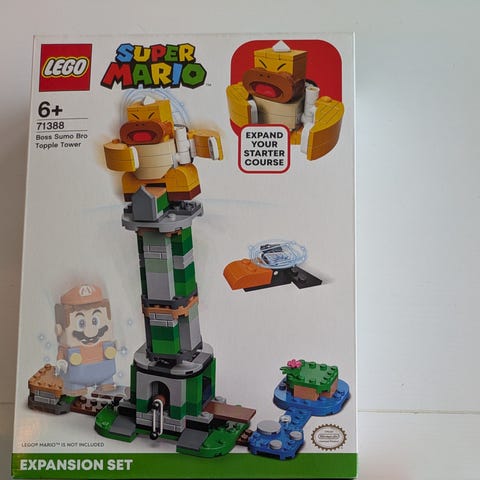La barn utvide LEGO® Super Mario universet sitt med en ekstra utfordring med ekstrabanesettet Boss Sumo Bro og tårnvelt. Settet inkluderer et tårn som vippes frem og tilbake når LEGO® Mario og/eller LEGO® Luigi (figurene følger ikke med) hopper på spakene ved tårnets fot. Tårnet kan bygges i ulike høyder, og en superstjerneblokk kommer til syne når Boss Sumo Bro veltes. Inkluderer også en figur av Crowber. (Merk: Man må ha startbanesettet 71360 eller 71387 for å kunne spille interaktivt.)