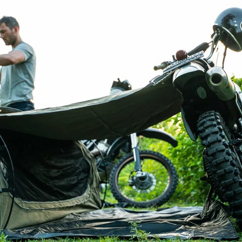 MotoTent har altså et fortelt med plass til å parkere sykkelen, ute av syne for nysgjerrige øyne og i ly for været. Det er også et fint oppholdsrom hvor du kan skifte oppreist, tørke våte klær, lage mat eller bare sitte og slappe av. Hekt av innerteltet og rull det ut til kanten, så har du et stort verksted for mekking ute av sol og regn.