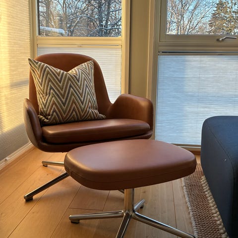 Leveres i to deler; understellet er laget av sortlakkert jern, sete er laget i kraftig lær.