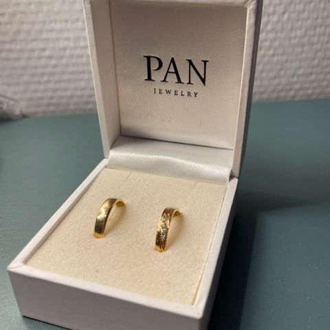 Butikkpris kr. 32180,-. Flotte forlovelsesringer i gult gull 585 14k med diamanter. Damering med 3x0,01 tw/si diamanter. Herrering glatt. Begge ca 4mm bredde og innvendig buet. Kvalitetsringer til en meget god pris. Gratis gravering og frakt. Leveres i eske. Vi har stort utvalg av forlovelsesringer på vår nettside.