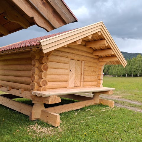 Denne hytta har ekstra grovt 10" furutømmer, fine utskjærte beitskier, labankdør med smidde hengsler.