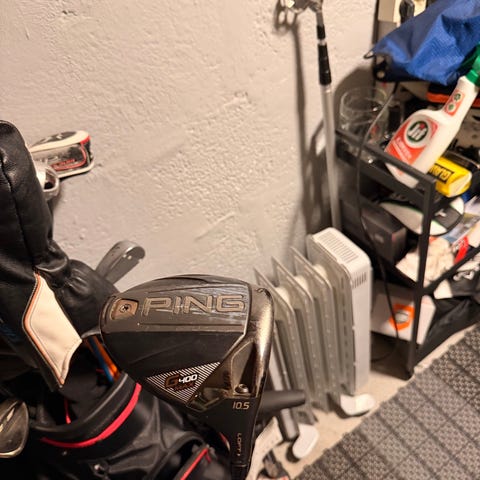Har en del golfutstyr: Driver, Wood, Hybrid, Bagger, Jernsett, Jernkøller osv