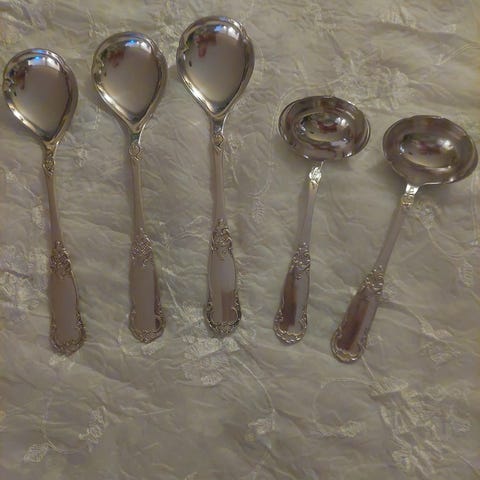 Jeg har også en del av mer sjeldne mønster som: Barokk 1, Barokk 2, Barnebestikk, Diverse Bonde Rokokko, Diverse Brudesølv, Bergensk Riflet, Brudekrone, Brødrene Nilsen, Dala, Dobbel Rokokko,Dobbelt Riflet, Dobbeltpresset Musling, Dovre, Drage Thune, Dronningmønster, Ekorn, Erindring, First Lady, Fasett, Funkis, Galla, Hamret Rose, Hamret, Hamret Skjel, Kavaler, Knipling, Kings Pattern, Katedral, Konval, Kloster, Krone, Kristiania, Lillemor, Laila, Musling, Nr 1914, Diverse Facon, Ibis, Iris, Kings Pattern, Minnesølv, Myrte, National Rokokko, Norsk Flora, Nina, Norrøna, Ny Linje, Olavsrosen, Oseberg, Oldemor, Oslo, Prinsesse, Queens Pattern, Ragnhild, Riks, Rita, Renessanse, Rococco, Rokokko, Ringebu, Romansk, Rådhus glatt og Rådhus med bord, Saga, Slottssølv, Sonja, Sognemønster, Skjell, Spissgravert, Sylvia, Taffel, Tone, Veddeløp, Victoria og Østerdal. Er det andre mønster dere ønsker deler til kan jeg være behjelpelig med å skaffe dette.