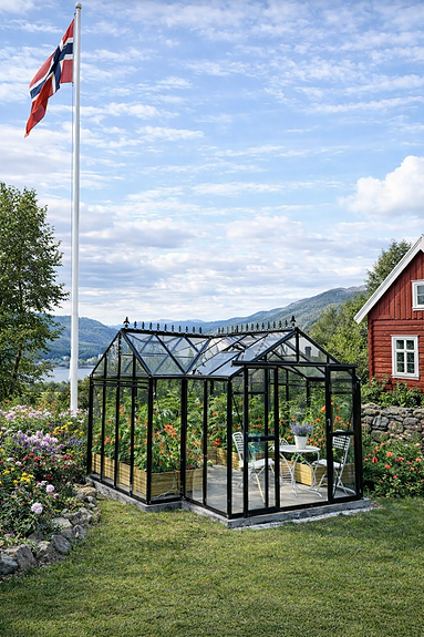 Et romslig, elegant og robust drivhus – bygget for norske forhold, og utviklet for deg som ønsker kvalitet, plass og et eksklusivt uttrykk i hagen.