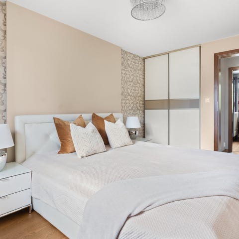 Herregårdseng har side og endegavler til gulv og om valgt, sengeskuffer integrert i sidevanger.