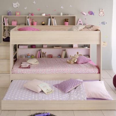 En av grunnene til at dette er en køyeseng som har falt i smak hos mange, er blant annet at den har plass til hele 3 barn. Den er i tillegg meget solid, laget av tømmer fra de franske skoger. Trappen opp til overkøya er trygg og god å gå i noe som er viktig om barnet må gå ned og opp fra den på natta.Den har også oppbevaringsplass i form av hyller både oppe og nede. Her kan det plasseres for eksempel nattlampe, bøker og andre praktiske saker.