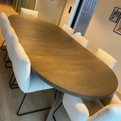 Hvor mange personer det er plass til rundt et spisebord avhenger litt av bredden på spisestolene, men generelt beregnes ca. 50-60 cm. per sitteplass.