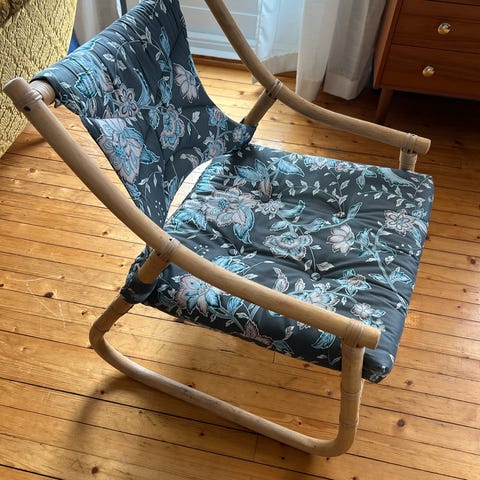 Det er noen bruksmerker og litt slitasje i trekk. Samt noen merker på et par av beina. Lar seg restaureres. Duk på innside må også festes, men dette er ingen synlig skade.