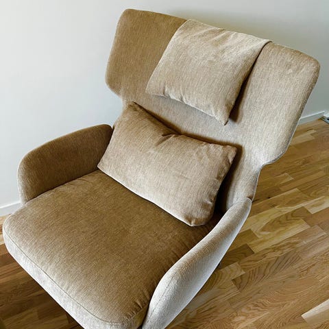 Denne flotte stolen produseres etter bestilling i ditt valgte tekstil, sjekk vår nettbutikk for mer informasjon eller om innom ossi Møllergata 32 i Oslo. Om ønskelig sender vi tekstilprøver i posten.