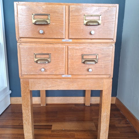 De varme, gyldne tonene i treverket fremhever skapets tidløse skjønnhet og tilfører en følelse av varme til ethvert rom. Det funksjonelle designet, med mange rom, gjør det ideelt for å organisere mindre gjenstander, samtidig som det fungerer som en slående dekorativ gjenstand. Dette skapet er perfekt for de som setter pris på vintage bibliotek-estetikk og ønsker en unik lagringsløsning som vekker følelser av historie og nostalgi.