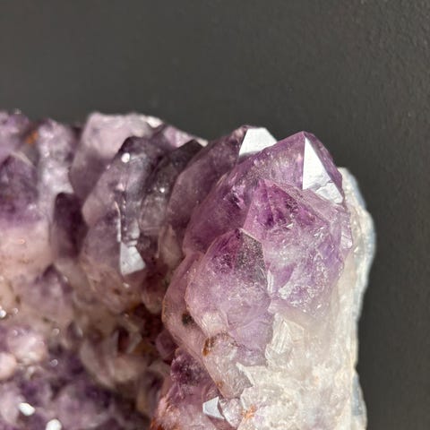 Farge: Ametyst er kjent for sin karakteristiske lilla farge, som kan variere fra lys lavendel til mørk lilla. Fargen skyldes tilstedeværelsen av jern og andre uregelmessigheter i krystallstrukturen. Noen steiner kan også vise fargegradering, med mørkere farger i bunnen og lysere på toppen.