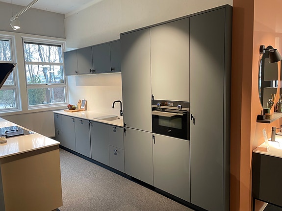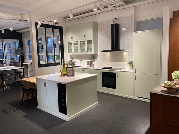 Vitrineskapene er i utstilling montert på vegg over kjøkkenbenk, men de kan fint stå på sokkel på gulvet.